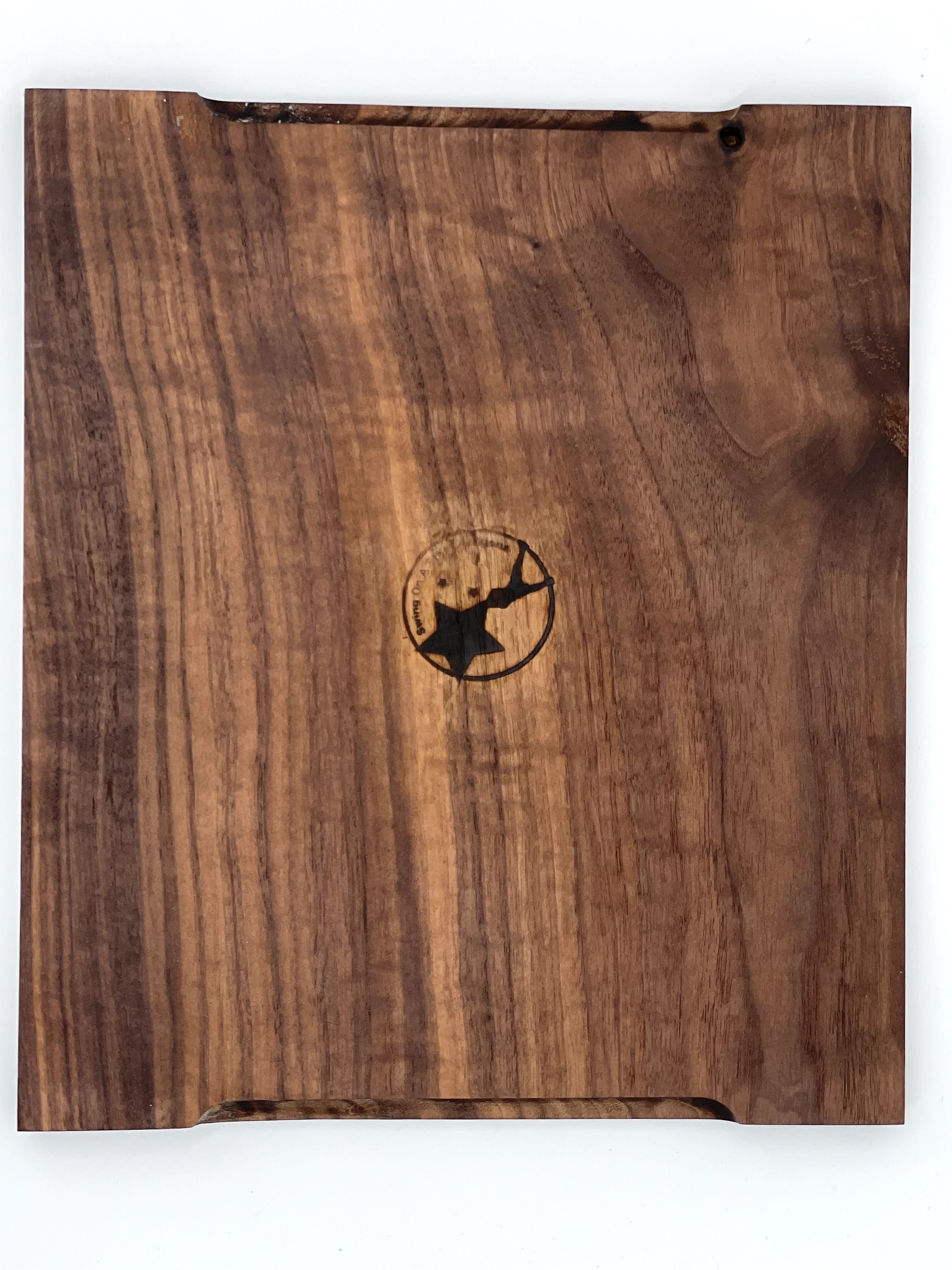 This is a 13.5” x 11.5” handcrafted, walnut board with handles carved into each side.