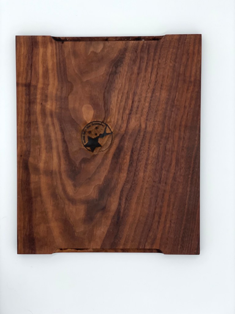 This is a 14” x 11.5” handcrafted, walnut board with handles carved into each side.